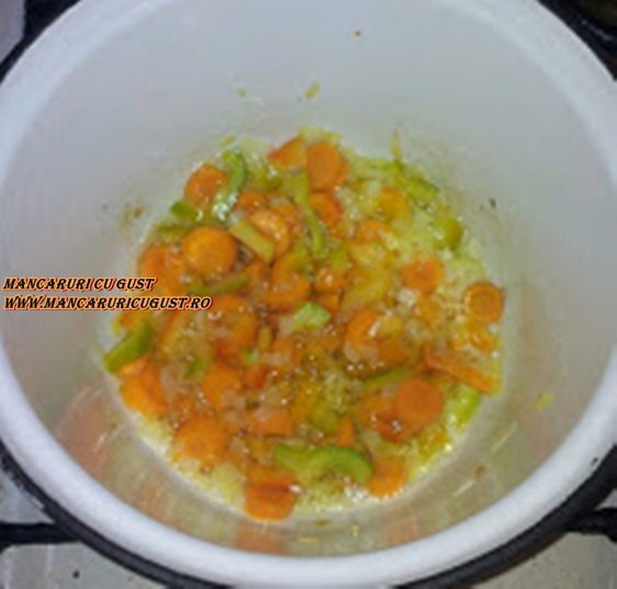 - In primul rand, curatam, spalam si tocam marunt legumele, apoi le calim 2-3 min. in uleiul bine incins. Dupa ce ceapa a deventi translucida, adaugam ciupercile taiate marunt.