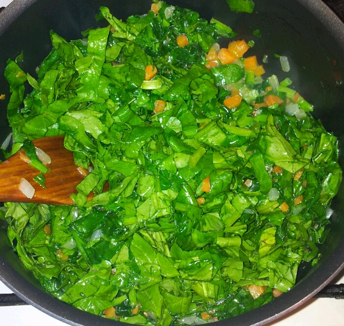 - Curatam, spalam si tocam legumele cubulete mici, apoi le sotam 2-3 min in uleiul incins; adaugam, treptat, spanacul, deoarece nu va incapea totul in ceaun, amestecam.
