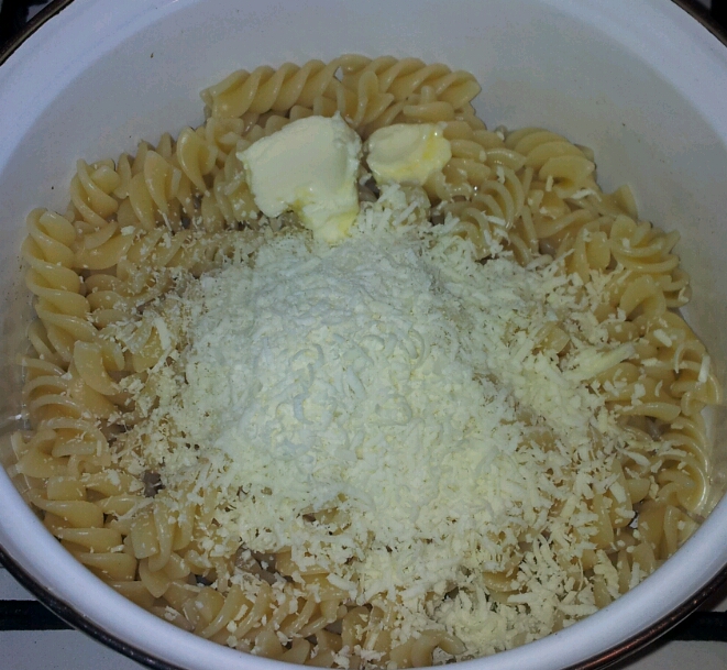 2. Cand pastele sunt gata, se strecoare, adaugam: untul, telemeaua rasa si, din nou, punem oala pe aragaz, pentru 2-3 min, amestecam sa nu se lipeasca de fundul oalei.