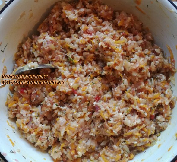 4. Intr-un bol sau un castron se adauga, laolalta, carnea tocata de  porc si pui, orezul, legumele sotate, 1/2 din rosii, verdeata tocata, sarea, piperul negru si se amesteca foarte bine.