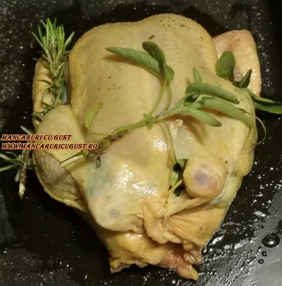 6. Se pune puiul intr-o tava, care a fost unsa cu ulei, iar deasupra se pune restul de rozmarin si salvie; se da tava la cuptorul preincalzit la 200 C, pentru cca 60 min.