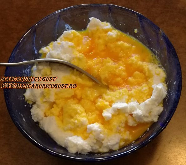 - Intr-un bol mai maricel, se adauga, laolalta: ricotta, sare, 2 oua si se bat cu ajutorul unei furculite pana se omogenizeaza complet.