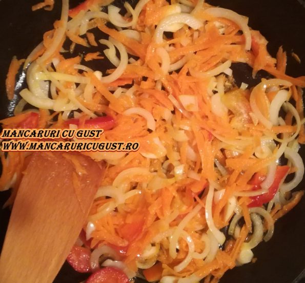 5. Intr-o tigaie, se adauga uleiul si se soteaza legumele doar 2-3 min, la foc mediu, doar pana ceapa devine translucida.