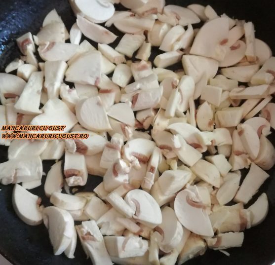 5. Cand apa lasata de ciuperci se va evapora si va incepe sa sfaraie, adica ciupercile vor incepe sa se prajeasca, lasam 2-3 min. amestecand din cand in cand, apoi adaugam sucul de rosii.